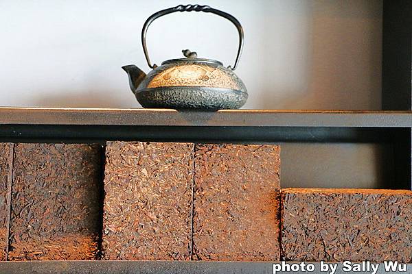 茶磚牆擺放著蓄熱能力強的鐵壺↓